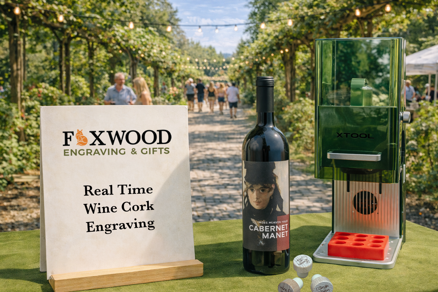 On-site engraving works best for smaller items such as wine corks, drinkware, wood ornaments, tags, and event-specific keepsakes. We’ll help select items that engrave quickly and consistently for live settings.
